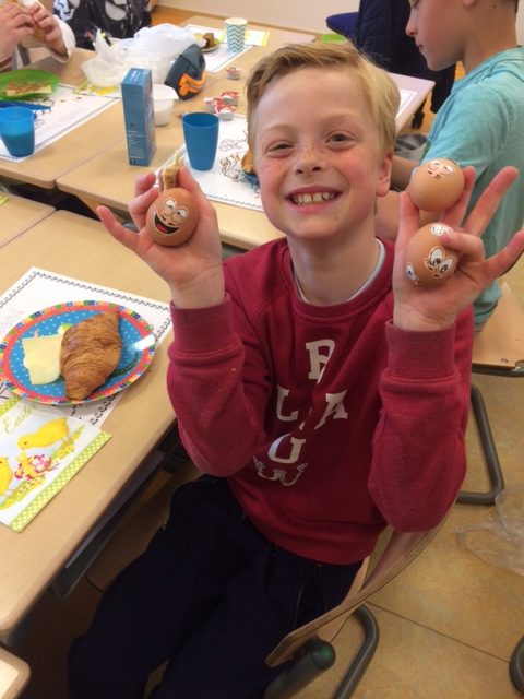 Vandaag mochten alle kinderen naar school komen in hun pyjama en begonnen we met ochtendgymnastiek. Daarna kregen alle kinderen een lekker paasontbijt en mochten ze per groep paaseieren zoeken op het kleuterplein.